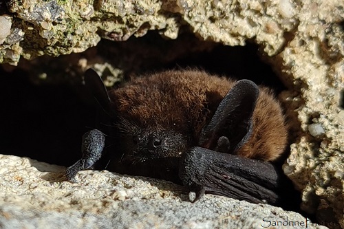 Pipistrelle commune - Pipistrellus pipistrellus Quel bonheur de pouvoir observer une chauve-souris de si près ! Cette Pipistrelle a élu domicile dans un trou de mur de l'enceinte de l'école. Le bruit et le passage régulier des enfants n'ont pas l'air de la déranger. À moins qu'elle n'ait trouvé ce refuge que pour se protéger de la tempête Kirk qui vient de passer sur notre région. Peut-être n'y sera-t-elle plus demain... Mais là, comme si elle avait besoin de se réchauffer, la petite chauve-souris profite des rayons du soleil de ce début d'après-midi et s'allonge sur les pierres chaudes, toujours prête malgré tout à faire demi-tour et à regagner les profondeurs de sa cachette en cas de danger imminent. Les vieux murs sont une vraie aubaine pour les animaux et abritent volontiers oiseaux, rongeurs, lézards, insectes et toutes sortes de plantes qui ne demandent pas grand chose pour pousser. Un véritable microcosme qu'il faut préserver pour le bien de toutes ces espèces ! (Ecole de Verrières 86, le 10/10/2024) ***** C'est pour contribuer à la protection de ces petits mammifères que nous avons signé, cette année, une convention auprès de la SFEPM, Société Française Pour l'Etude et la Protection des Mammifères. Le Label "Refuge pour les chauves-souris" nous a été attribué et nous espérons que cette cohabitation durera encore très longtemps. (Bouresse, 30/08/2015)