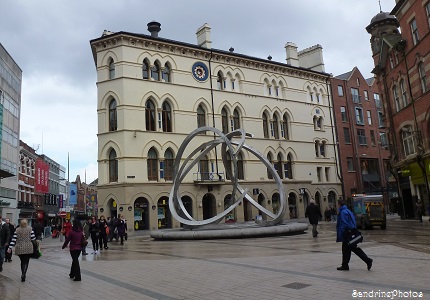 Gigantesque Hôtel de ville construit sous le règne de la Reine Victoria en 1898. The Albert Memorial Clock Construit en 1870 en l'honneur du Prince Albert, cette tour surnommée Little Big Ben, renferme une cloche de deux tonnes. Statue de la Reine Victoria (1819-1901) Elle fut Reine du Royaume-uni et d'Irlande de 1837 à sa mort. The Spirit of Belfast - Arthur Square L'art tient une grande place dans les rues de la ville et à chaque carrefour, sur chaque place, s'élèvent des structures originales comme The Spirit of Belfast, l'Esprit de Belfast, conçue par Dan George en 2009.