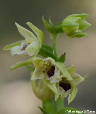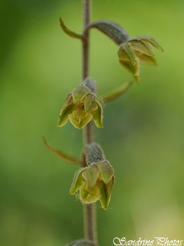 Epipactis des dunes - Epipactis phyllanthes L'Epipactis des dunes est une orchidée sauvage qui pousse exclusivement sur la côte Atlantique et plus spécialement sur les côtes vendéennes. Ses petites fleurs vertes en forme de clochette, parfois teintées de jaune ou de pourpre, sont pendantes. On la nomme d'ailleurs Epipactis à fleurs pendantes ou Helléborine à fleurs vertes. Son labelle est blanchâtre et prend la forme d'une feuille. Elle fleurit de juin à septembre sur les dunes ou dans le sol sableux des forêts d'Yeuses et de Pins qui longent le littoral. Rare et localisée, elle est protégée au niveau régional. (Le Pey de la Blet, La Barre de Monts, Vendée, 29 juin 2024) ***** Epipactis des marais - Epipactis palustris Les Epipactis des marais se font très rares dans la Vienne. C'est dans les Pyrénées Orientales, en montant au village de Jujols, que nous avons trouvé celle-ci. Elle poussait dans une petite résurgence de la source du village, nullement inquiétée par la sécheresse estivale. Sa fleur blanche légèrement veinée de pourpre est caractérisée par un long labelle dentelé et articulé. De petites crêtes jaunes entre les deux parties du labelle produisent du nectar et attirent ainsi les butineurs. (Jujols, Pyrénées orientales, 12/07/2015) Voir plus de photos ***** Epipactis de Müller - Epipactis muelleri L'Epipactis de Müller est une plante de taille moyenne aux feuilles légèrement ondulées et aux fleurs jaune pâle retombantes. Son coeur, l'hypochile, est de couleur rouge sombre. La pointe de son labelle est enroulée sur elle-même et ses sépales sont dirigés vers l'avant. Elle pousse sur pelouse calcaire en lisière de forêt mais son habitat est fortement menacé par le déboisement ou l'élévage. Celle-ci, par exemple, pousse dans un pré à moutons et cela tient du miracle qu'elle ait pu fleurir. Cette orchidée est protégée en Poitou-Charentes. (Persac, 28/06/2015) *****